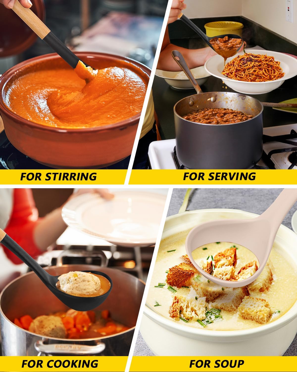 - More Safe and Healthy : Our Soup Ladles are made of food-grade silicone, free of BPA; Even at high temperatures, there is no need to worry about melting or deforming; And the soft silicone head won't scratch the coating, it can better protect your pot