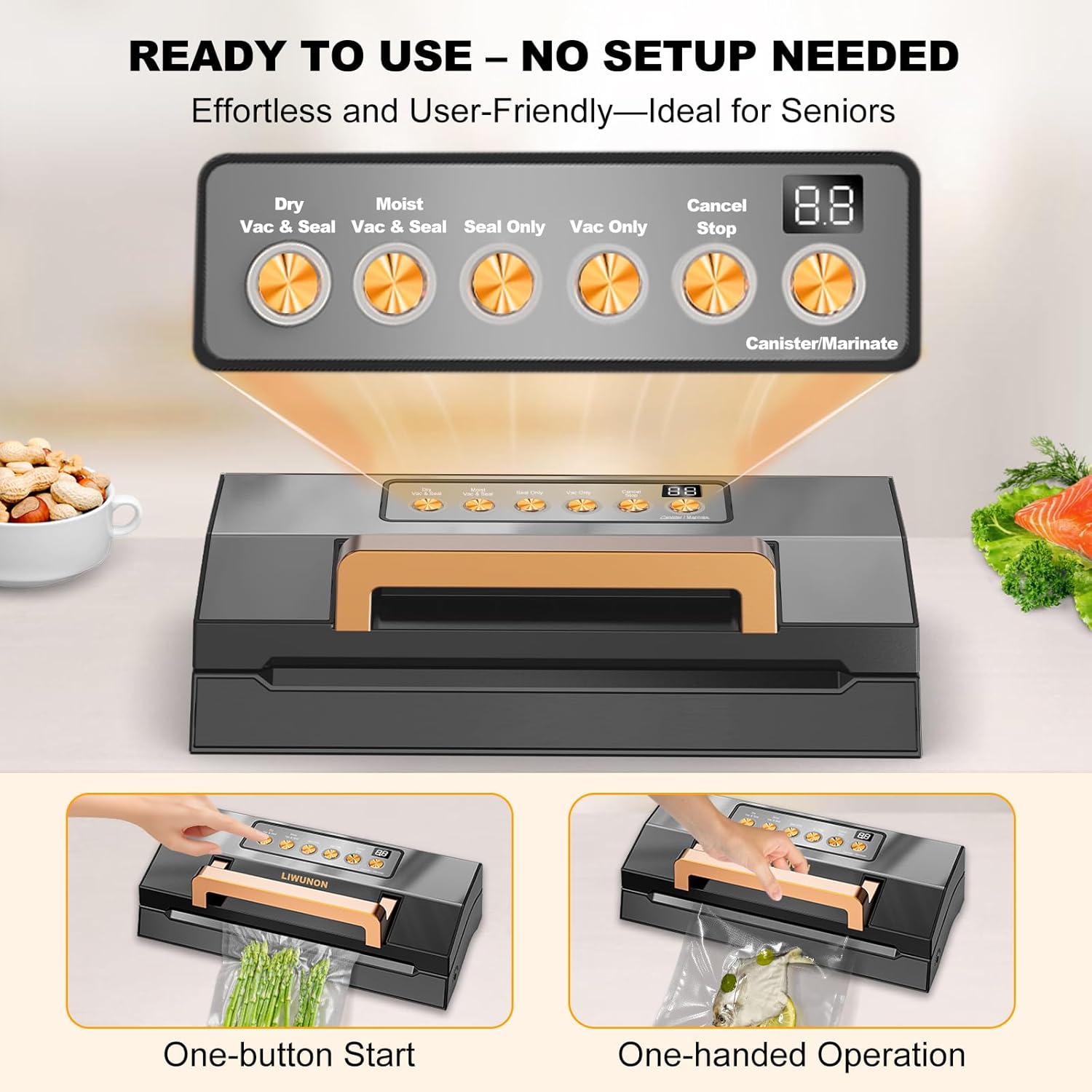 - 【User-Friendly Design】Simplified One-Touch Design – Easy for All Ages to Operate.Liwunon food vacuum sealer machine features one-touch operation and a one-handed lock, replacing complex multi-button systems. It’s easy to use, even for seniors. With built-in cutter, bag storage, and included accessories, sealing is faster, simpler, and more accessible for every household.