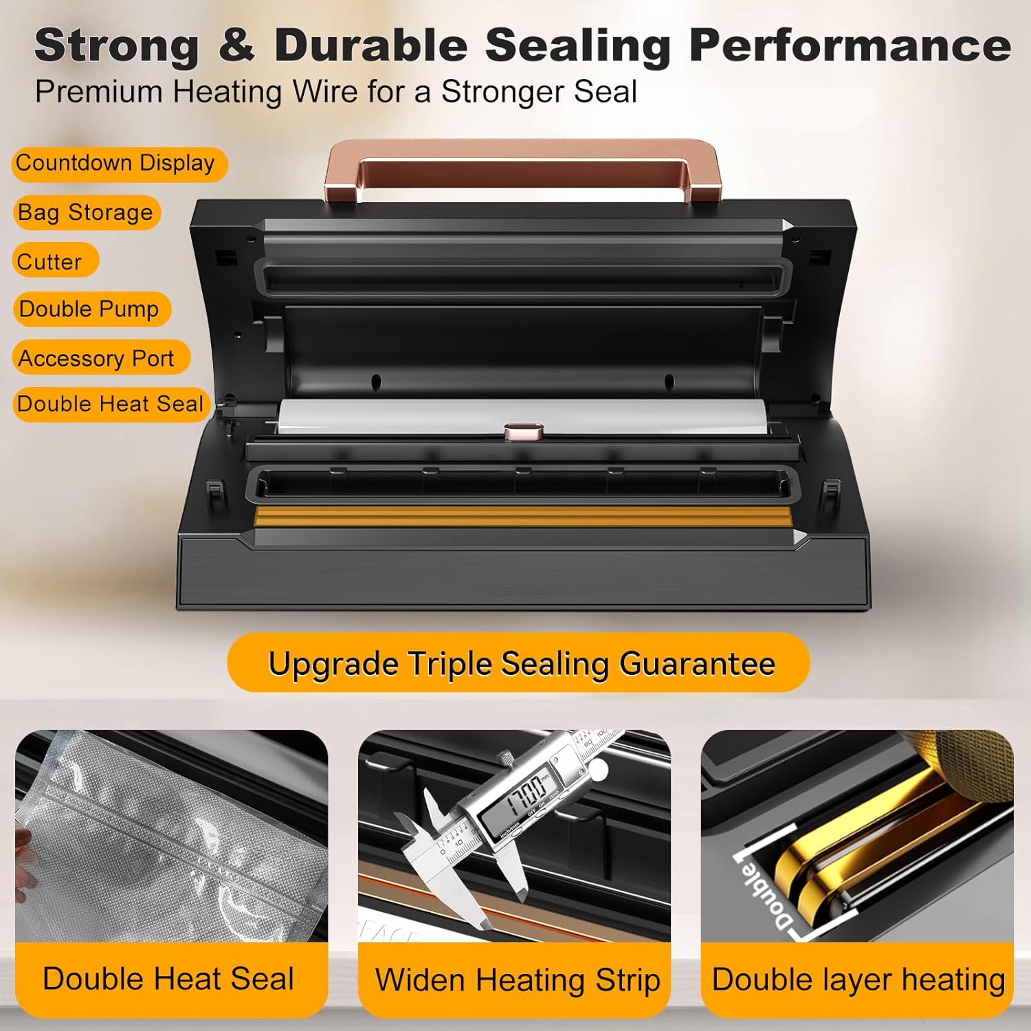 - 【Premium Sealing System】 As a premium vacuum sealer, our intelligent dual‑heat, dual‑strip mica design auto‑adjusts temperature to bag edges and moisture. This vacuum sealer for food and food sealer delivers perfect, leak‑proof seals every time—no wrinkles, no freezer burn—making it the ultimate sealing machine.