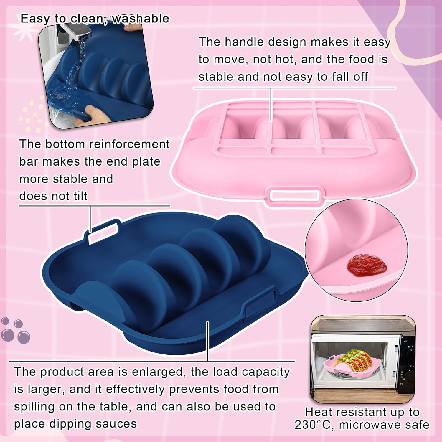 - Silicone Taco Plates: reusable taco plates are made from silicone material, heat/cold resistant, durable and easily transferred without bending; Besides, designed with handles and larger area, it is convenient and safe to take plates without slope