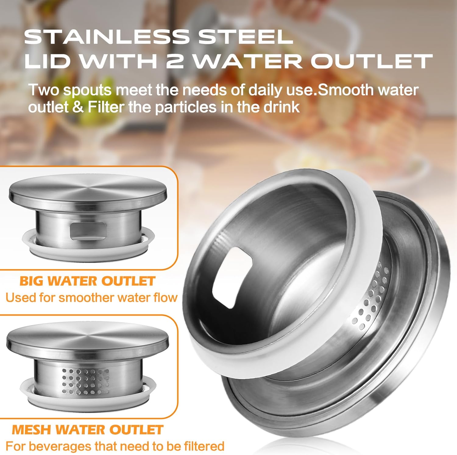 - MATERIALS & SIZE - It is made of high borosilicate glass with a thicker wall to ensure a longer life. This ices tea pitcher come with a 18/8 stainless steel lid with two different types of spouts. The size of the glass carafe: 4.72“(6.5” including handle)*3.66“*11.61”, the compact size won't cause any trouble for storage.