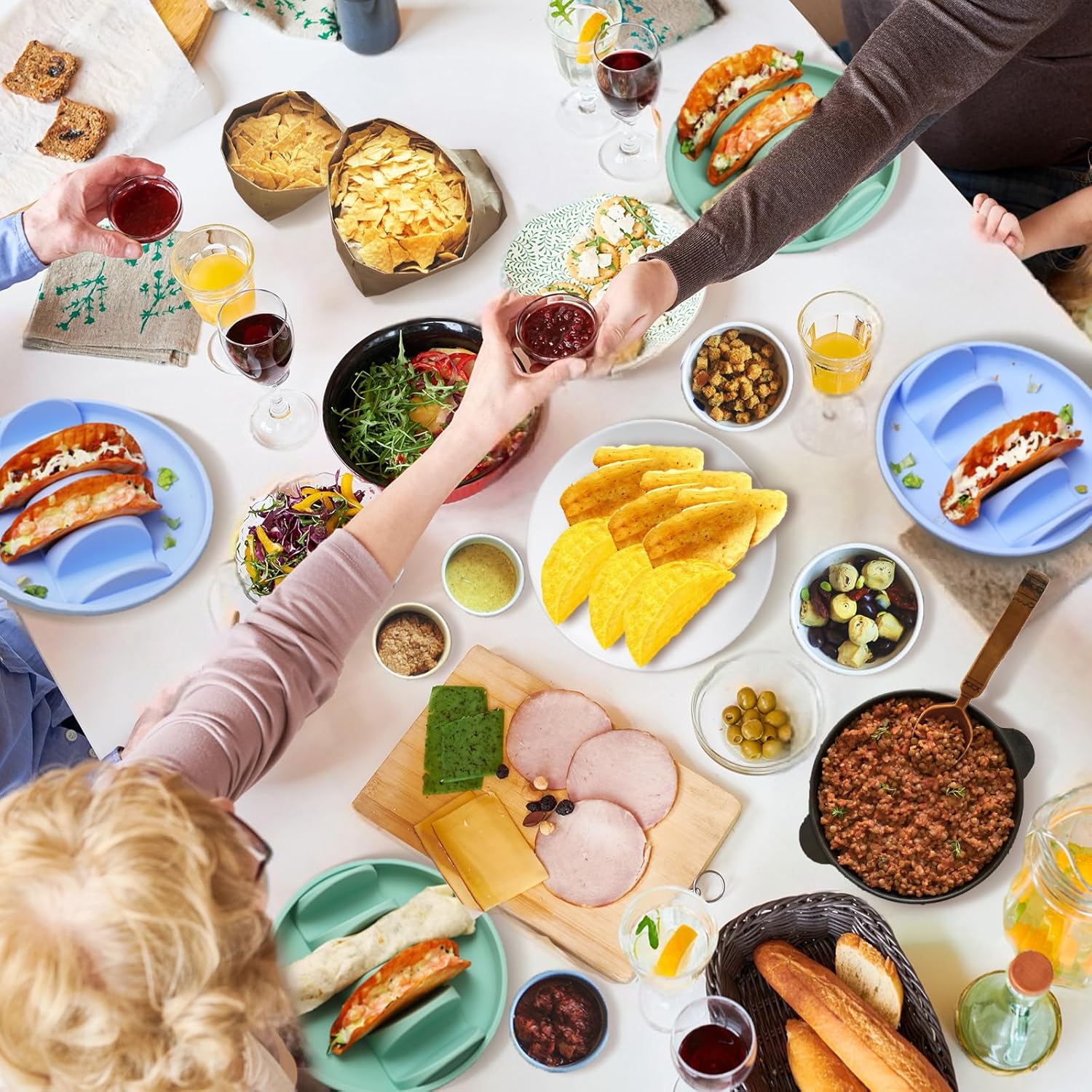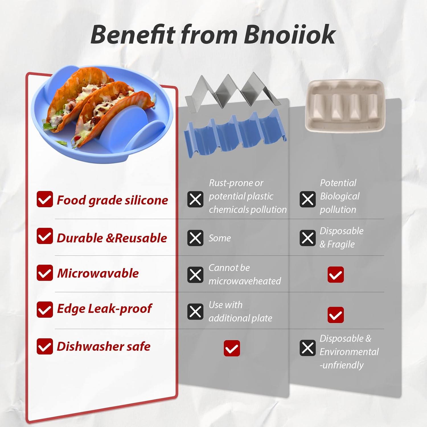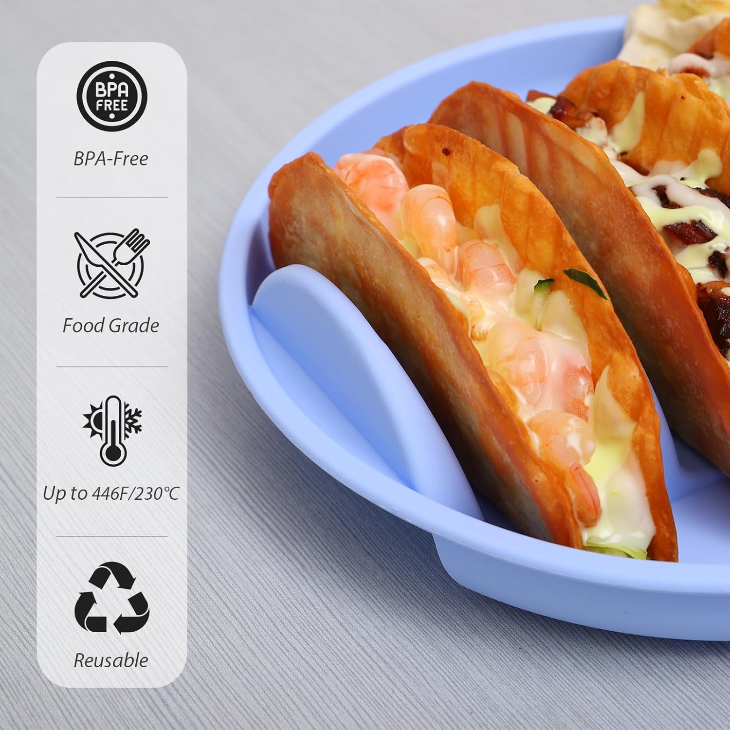 - Food-Grade Silicone: The Taco plate made of premium BPA-free silicone material, fridge safe, dishwasher / microwave / air fryer safe, allow you heat tacos directly with tray. Lightweight for hand-holding. Reusable, yet long lifespan! Shatterproof for all family member.