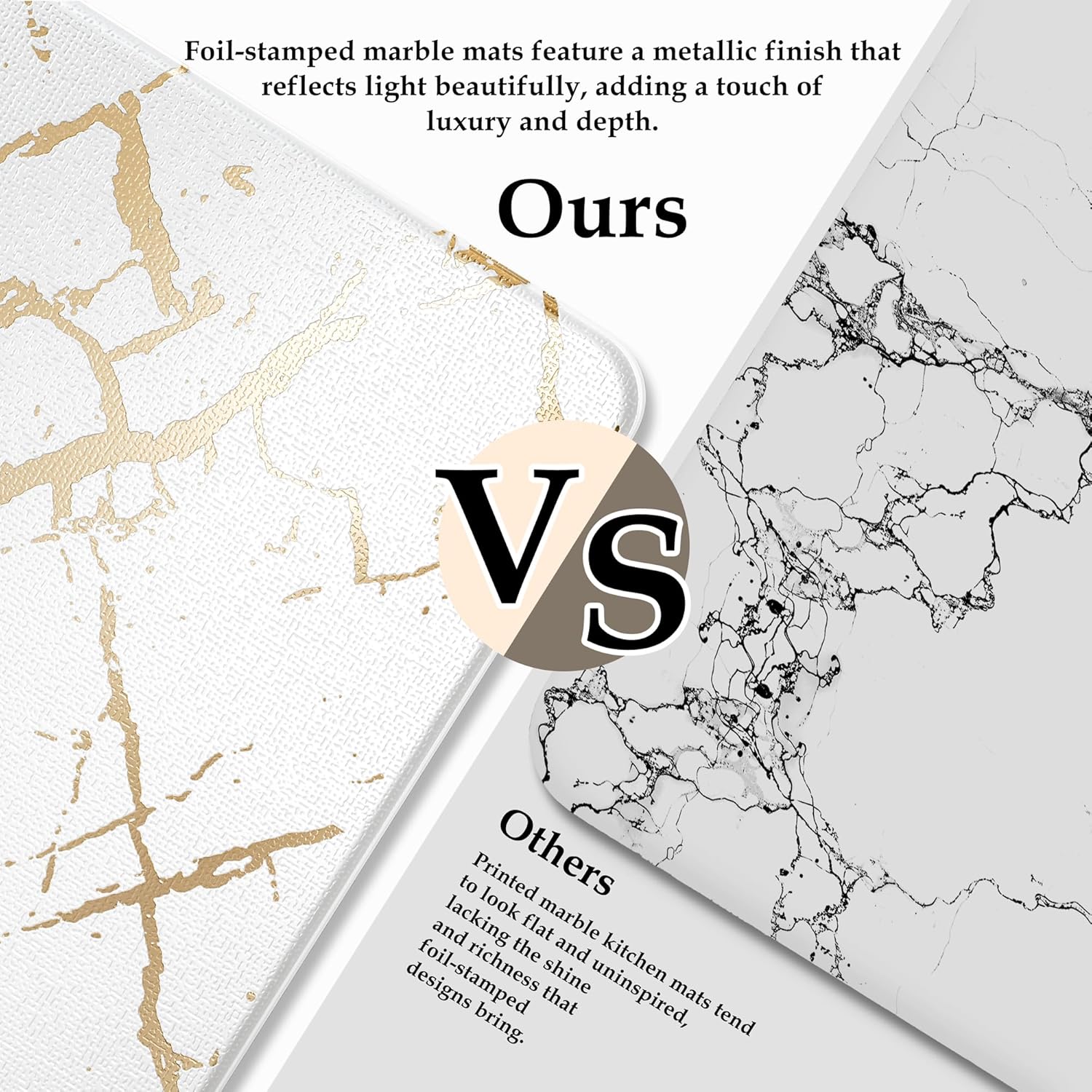 Gold Foil Stamped Marble Kitchen Mats for Floor 2PCS Cushioned Anti Fatigue Non Slip Waterproof Comfort Leather Kitchen Rugs 2/5 Inch PVC Kitchen Mats for Sink, Laundry, 17.3"x28"+17.3"x47",White