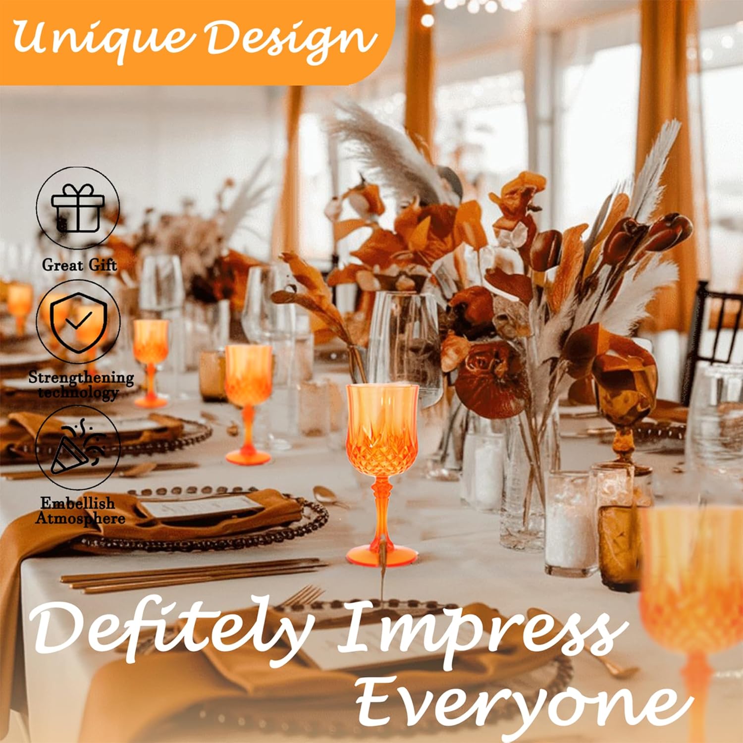 - 🍷🍷🍷【Product Description】 This set includes 24 retro-style pumpkin orange party plastic wine glasses, providing ample quantity to meet your daily use and replacement needs. The elegant and sophisticated design makes your wedding reception unique