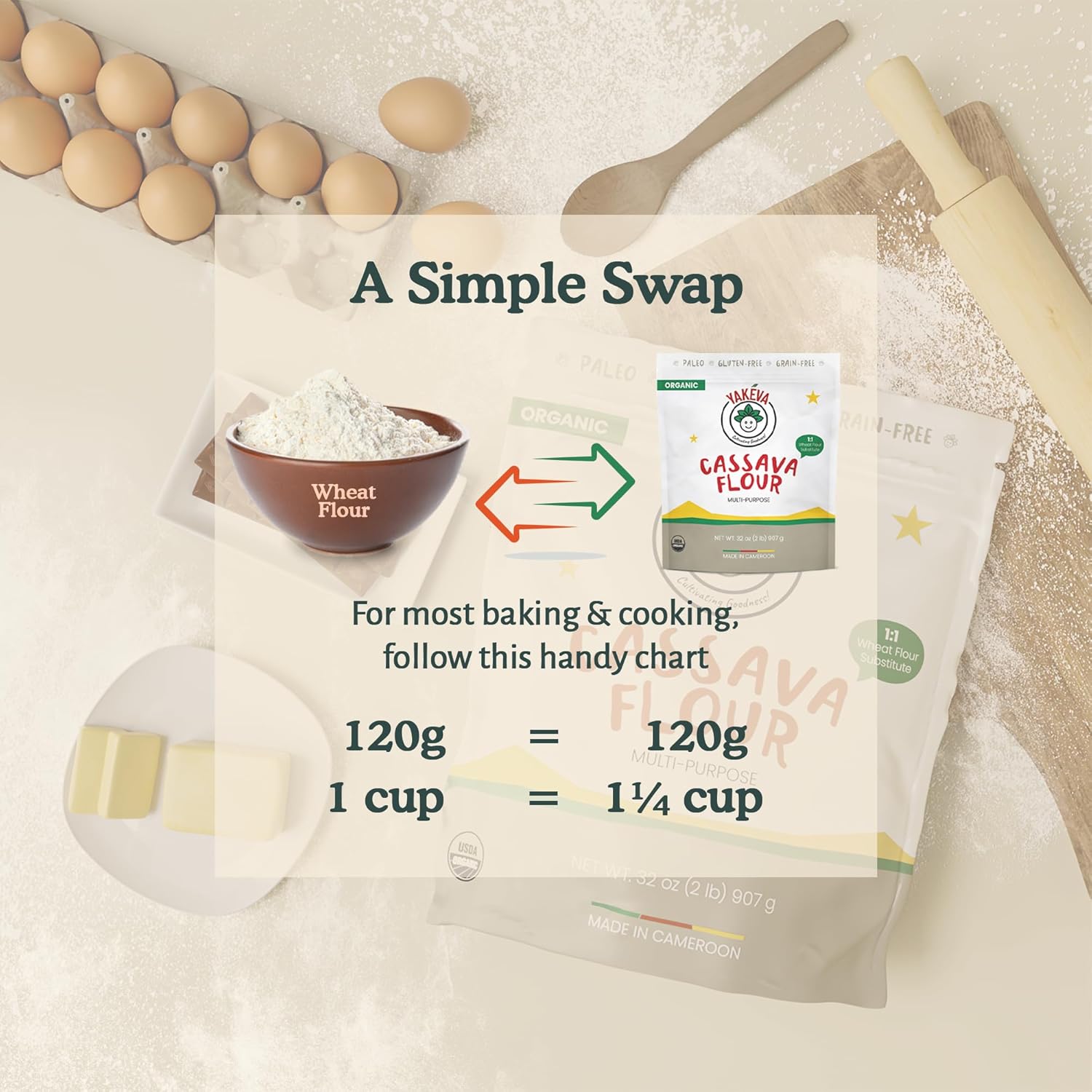 - HOW TO USE: Our all-purpose cassava flour can be used in your favorite recipes, swapping wheat flour 1 for 1 if you’re measuring by weight, or 1 cup of wheat for 1 ¼ cup of our flour. It’s an easy change to make!