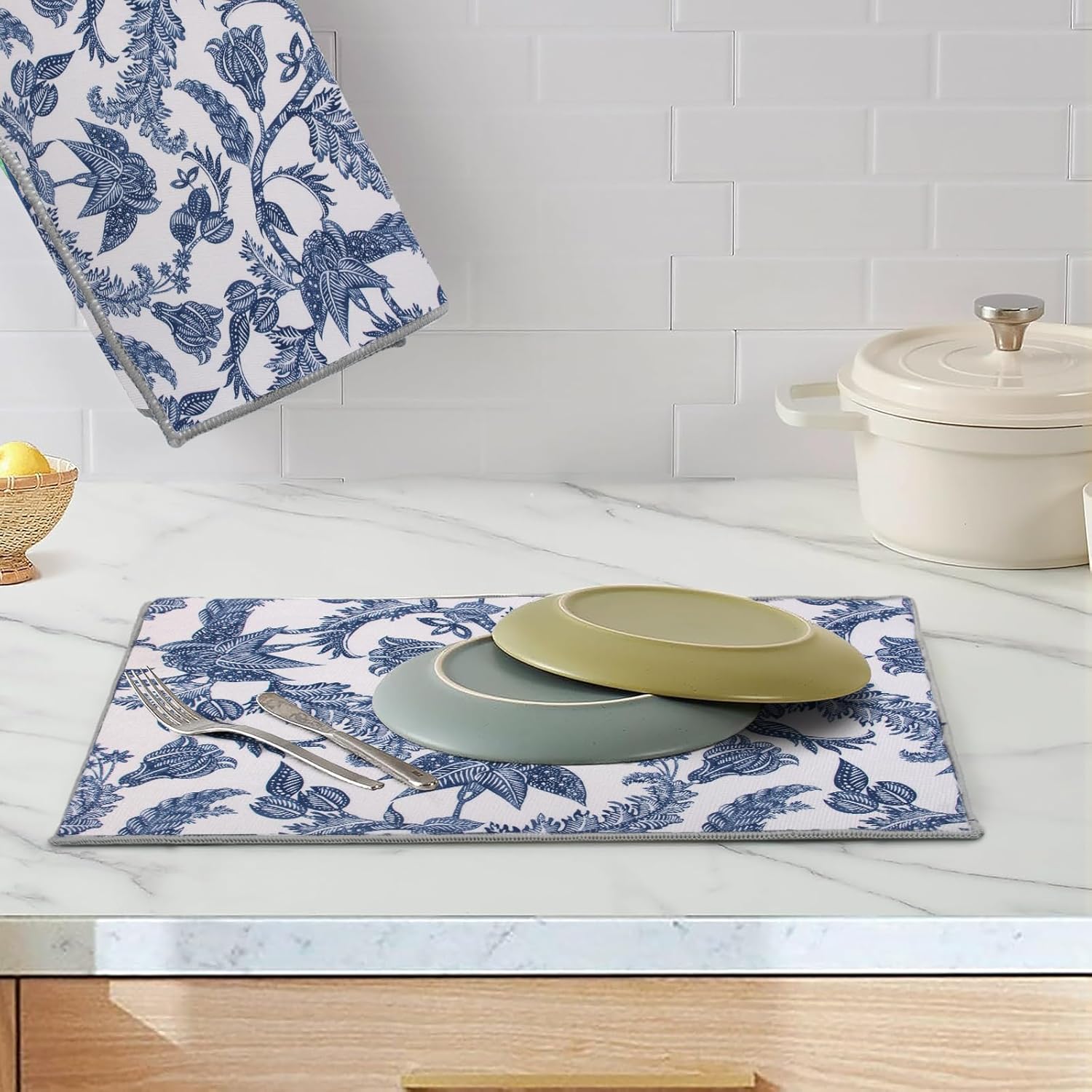 2 Pack Dish Drying Mat, 18" X 16" Blue and White Porcelain Dish Draining Mats, Small Dish Drying Mat,Drying Dish Mat, Self Drying Mat For Kitchen Counter