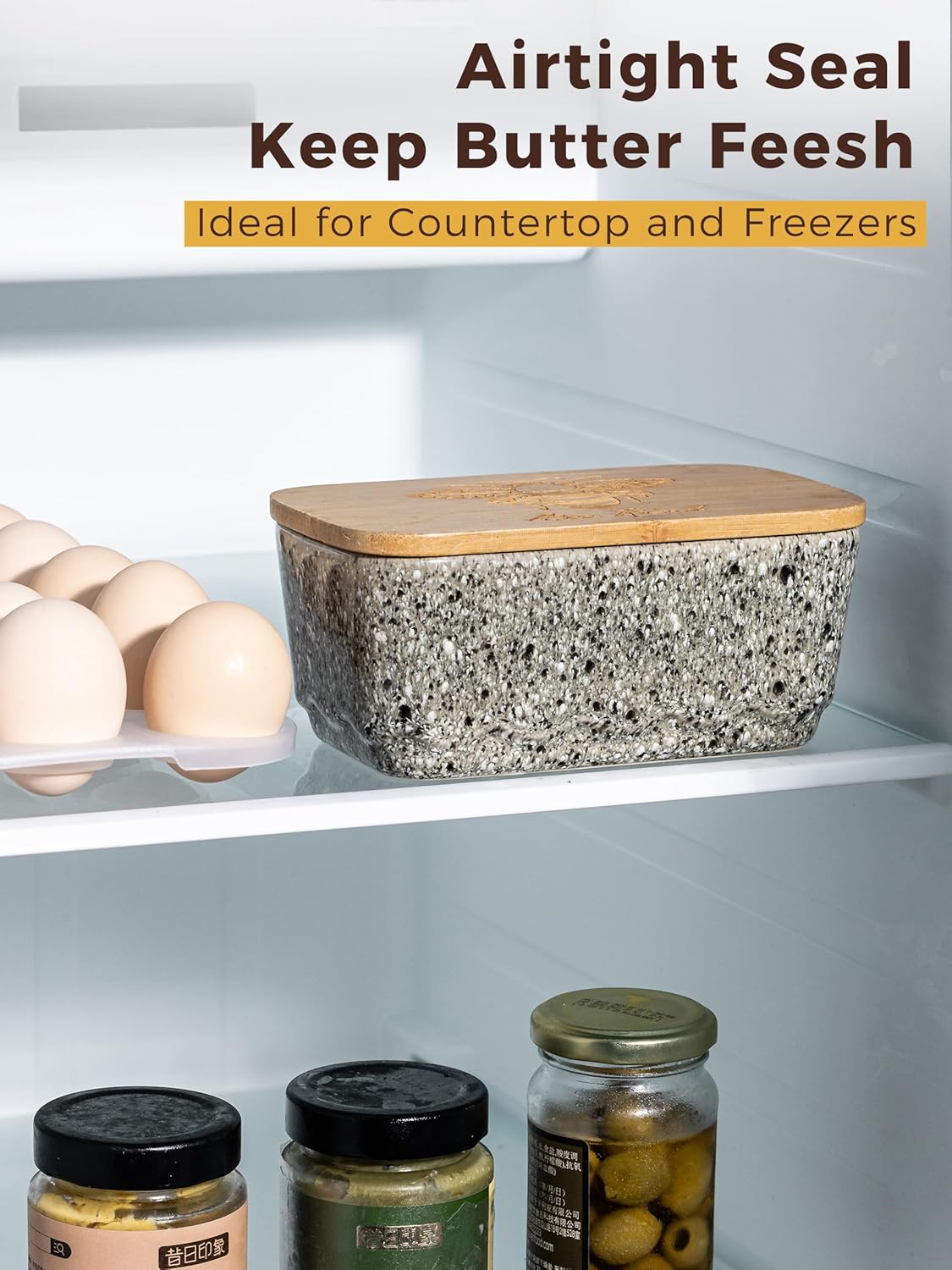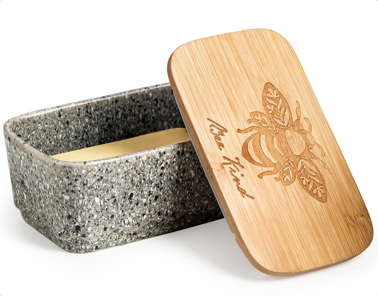 - Enhance Your Kitchen Decor: Add a farmhouse touch to your kitchen with this ceramic butter dish with lid. Available in 4 stylish colors, the honeybee pattern on the wooden lid and wave design complement any kitchen decor
