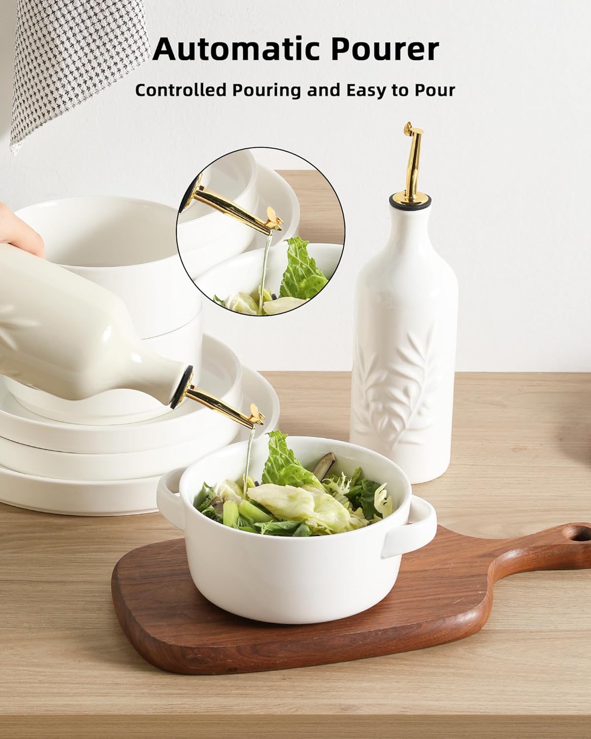 - Modern Relief Design -The bottle body is embossed with olive leaves, which looks elegant and delicate.Precision dumping, bottle body design has a unique spout, can perfectly pour out the oil and vinegar will not leak, the correct control of the use of oil.