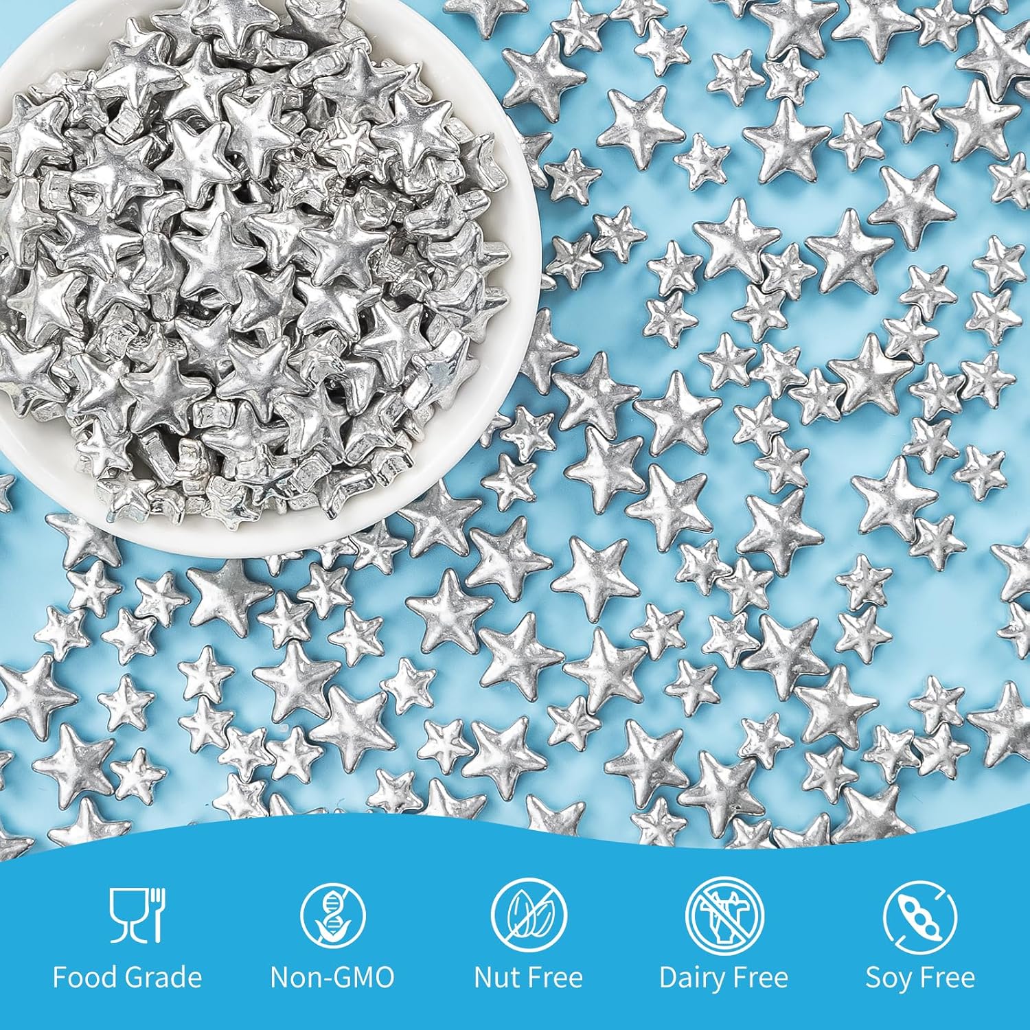 - Silver Star Sprinkles with food-grade raw materials:Preservative Free,Nut Free,Dairy Free,Chemical Free,Soy Free,Non-GMO.Produced using food-safe standards,the process does not come into contact with allergenic substances and uses Tamper-proof food label