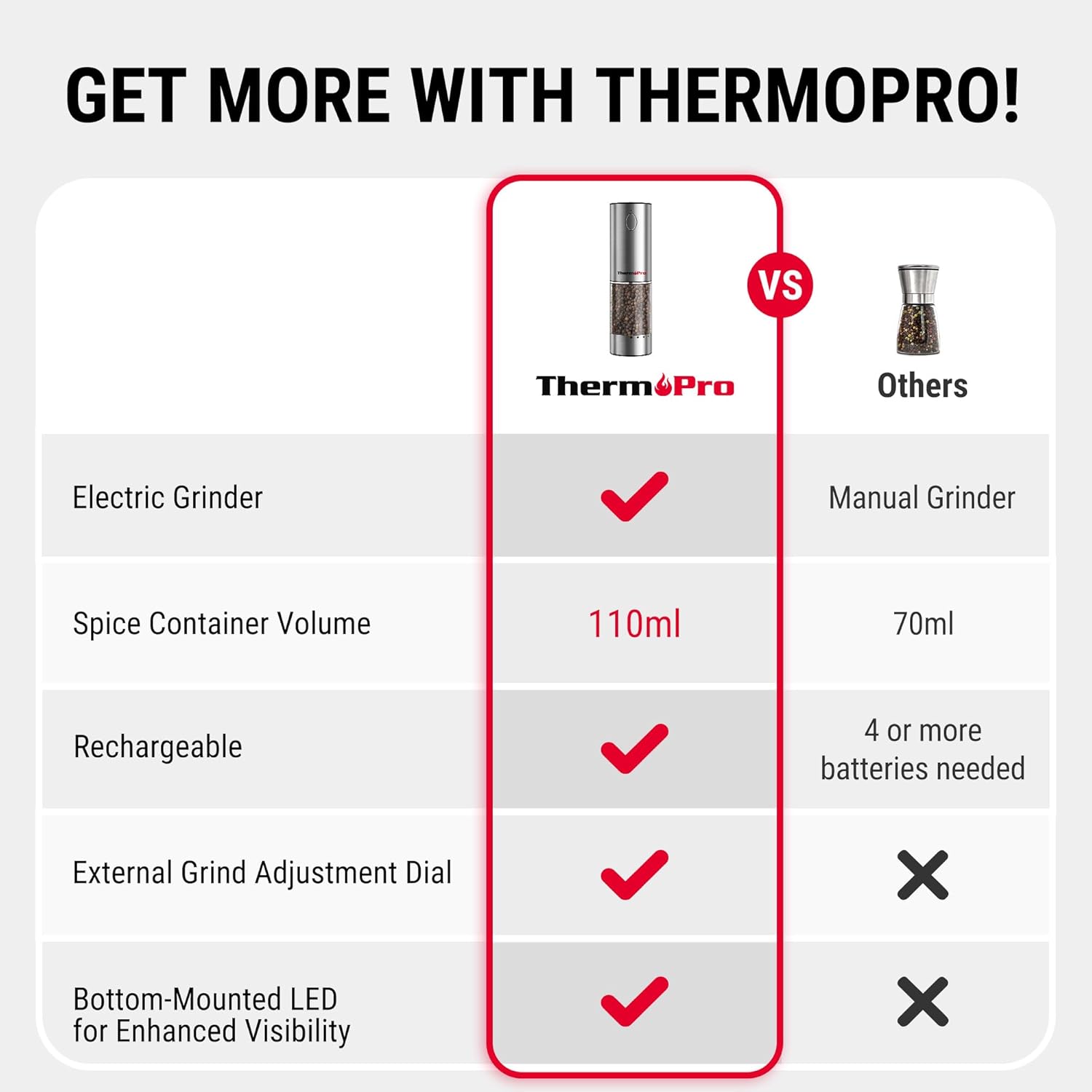 ThermoPro 110ml Electric Salt and Pepper Grinder Set Rechargeable, Automatic Pepper Grinder Shakers with External Adjustment, Refillable Pepper Mill Set with Dust Cover & LED, Stainless Steel 2-Pack