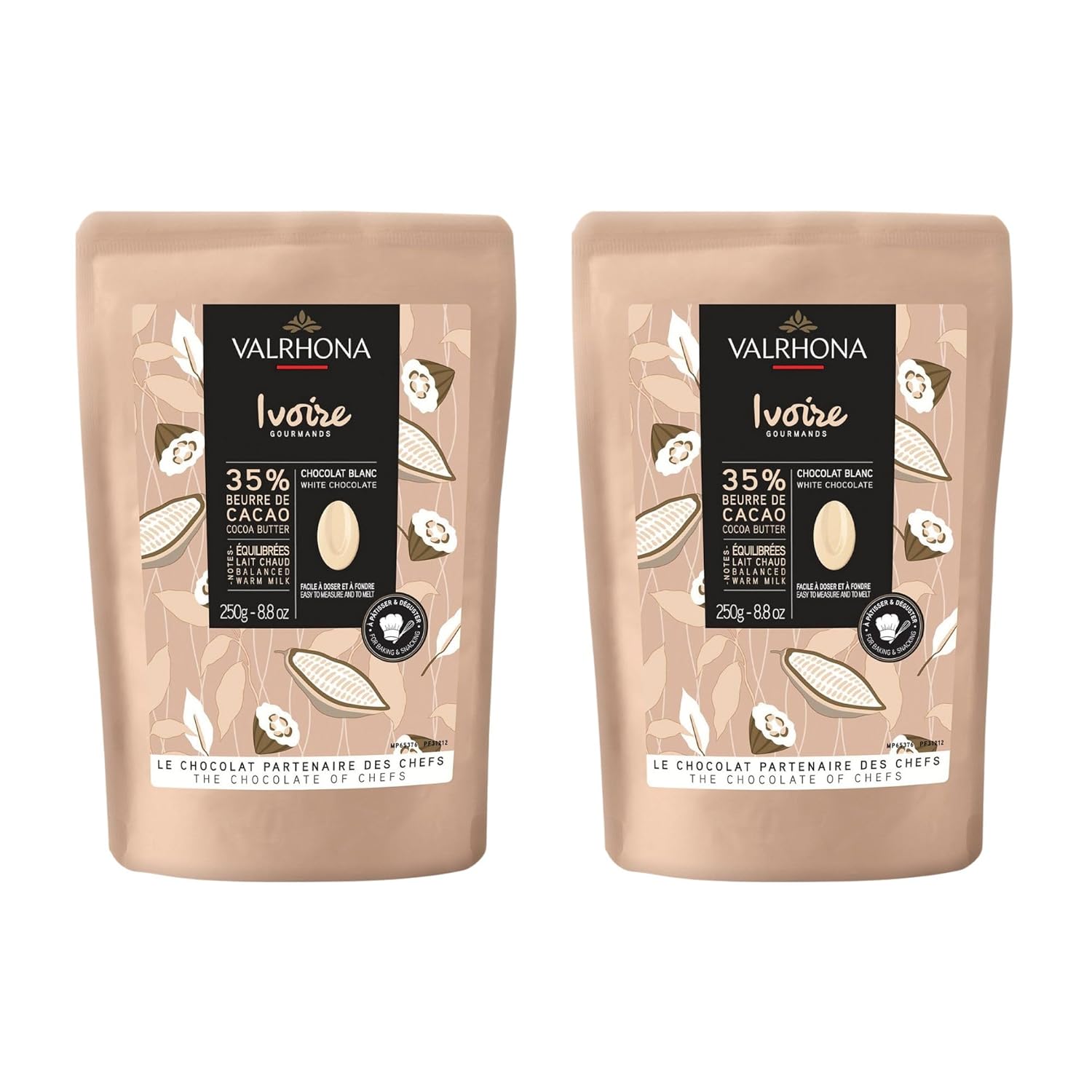 Valrhona Premium French Baking Creamy White Chocolate Discs (Feves) IVOIRE 35% Cacao. Easy Melt and Tempering. Hints of Vanilla & Warm Milk. For Sauces, Mousses, Frostings and Candies 250g (Pack of 2)