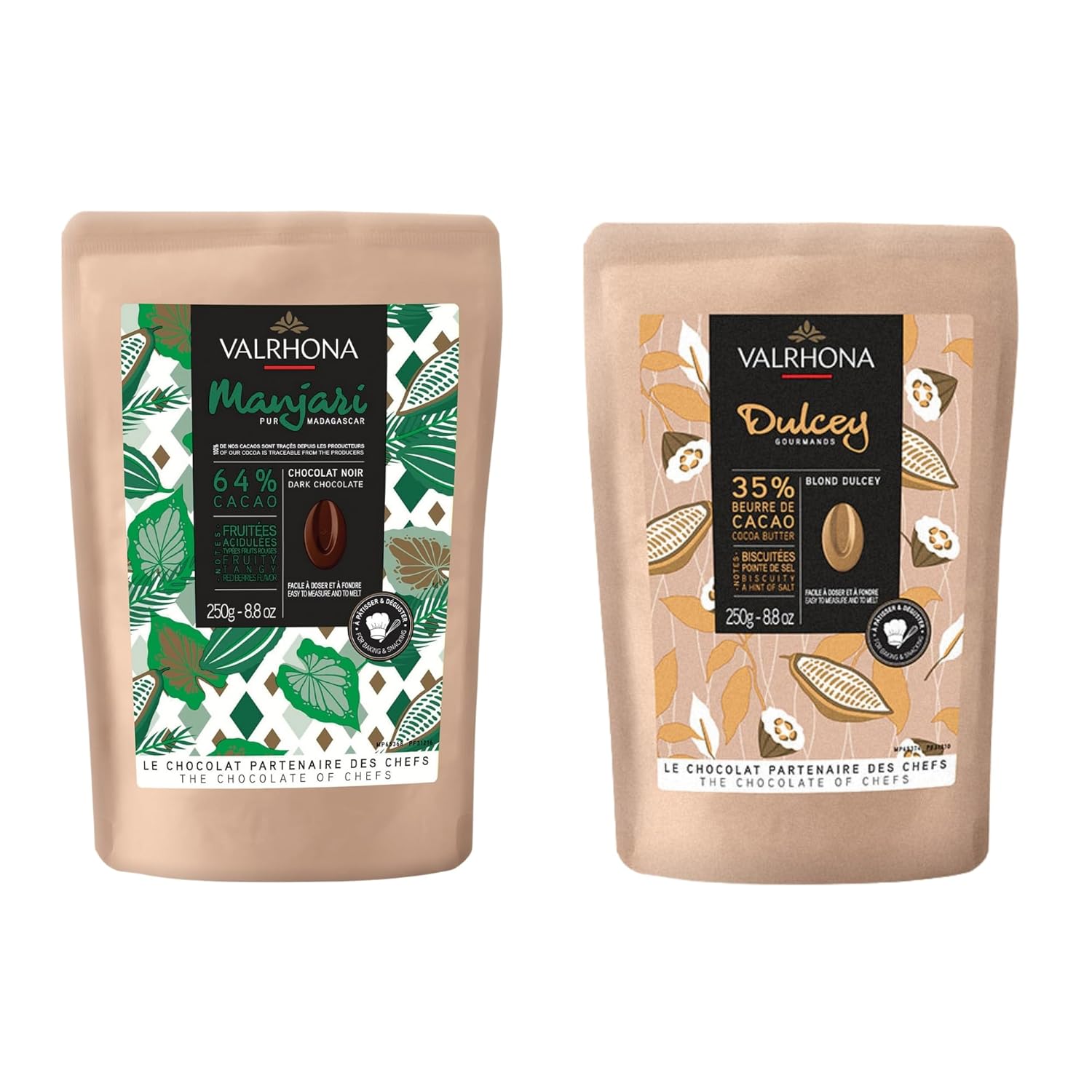 Valrhona Premium Baking Chocolate Discs (Feves), Dark Chocolate MANJARI 64% Cacao Single Origin, and Creamy Blonde Chocolate DULCEY 35% with Caramel Cookie Flavor Notes, for Cookies, Cakes, and more
