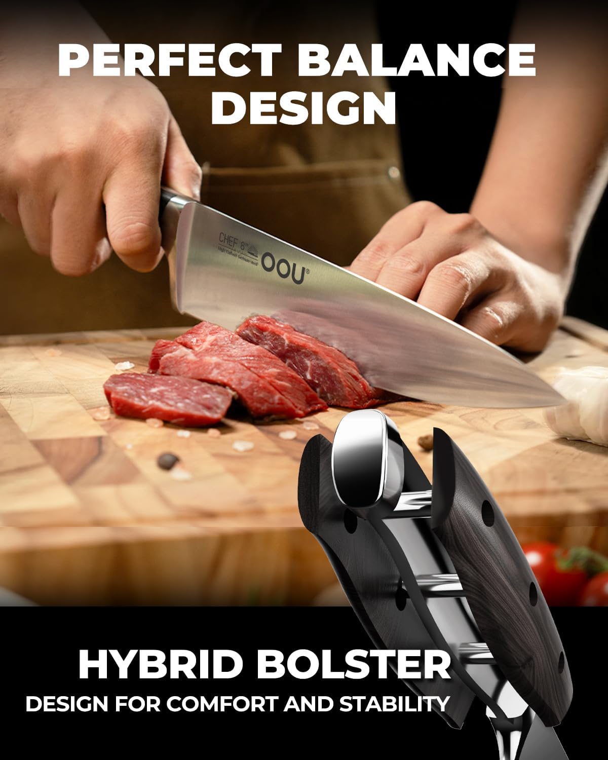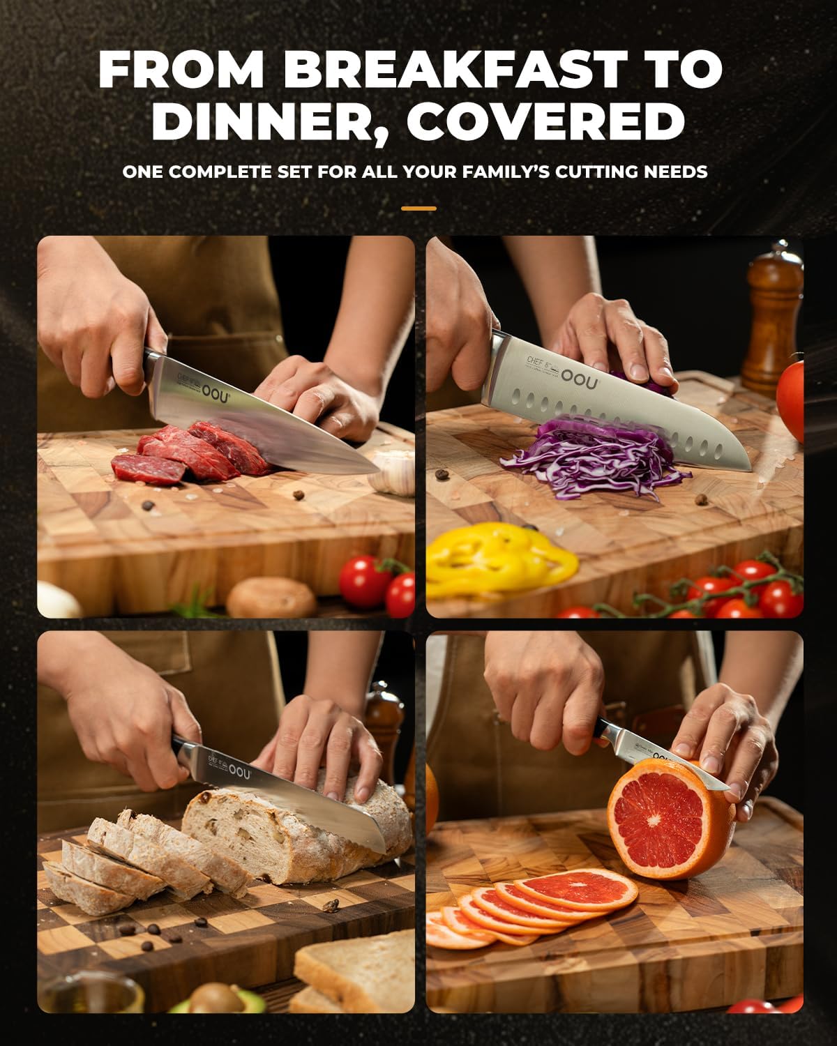 - Lifetime Service and Assurance: OOU knives set are crafted for exceptional hardness, edge retention, and corrosion resistance, ensuring they remain sharp and reliable for years to come. We stand firmly behind the quality of our knife set with block, offering a 100-day return policy and lifetime assurance — not just a set of knives, but a lifelong culinary companion.
