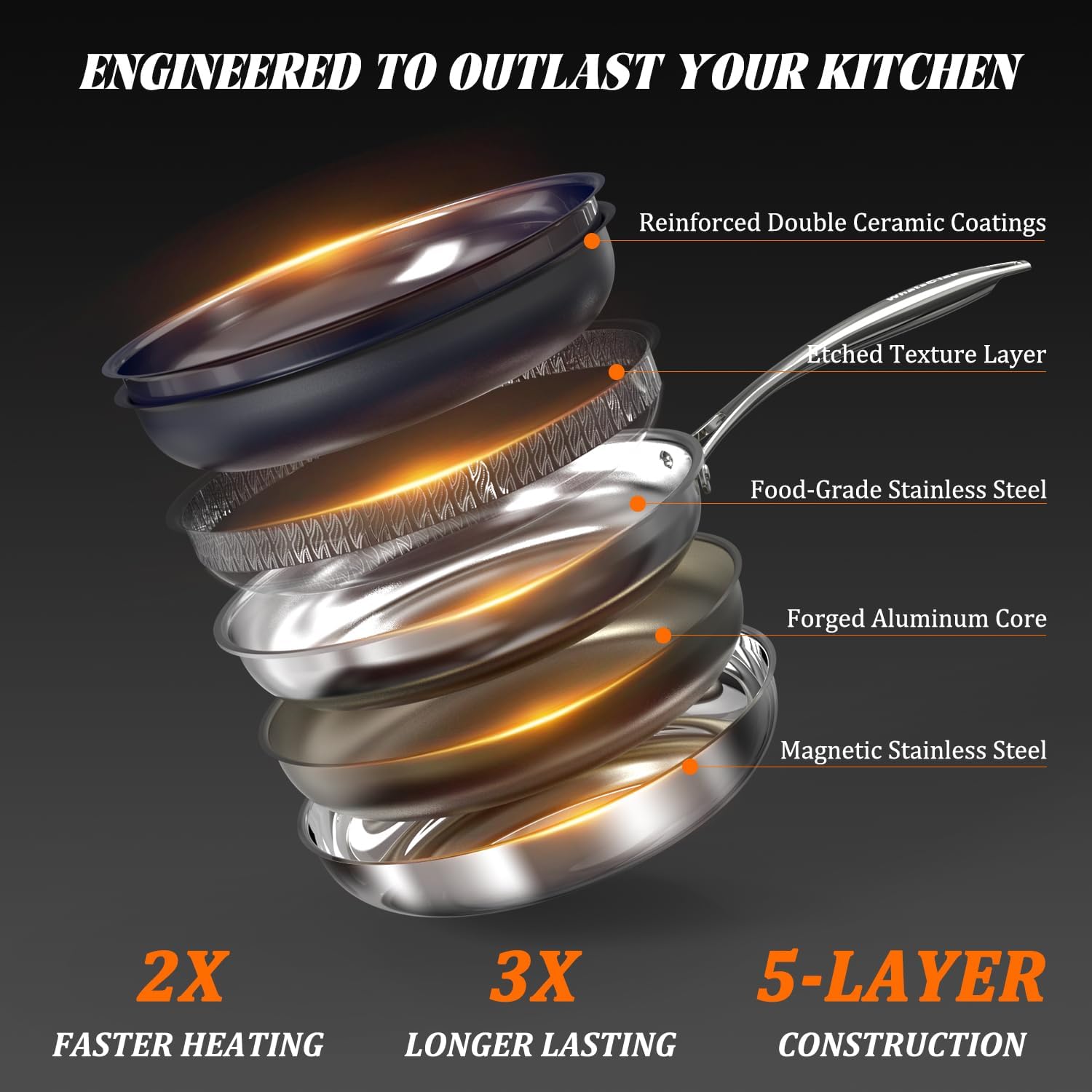 - Built to Last: Unlike traditional ceramic nonstick pans that are useless once their coating wears off, our hybrid frying pan is built to last a lifetime. Its robust, full-clad construction of food-grade stainless steel fully encapsulates the aluminum core, so you can continue to use the pan with peace of mind even if the ceramic coating wears off over time. This design provides exceptional stability and resistance to warping, dents, and separation, a clear upgrade from flimsy disc-bottom pans