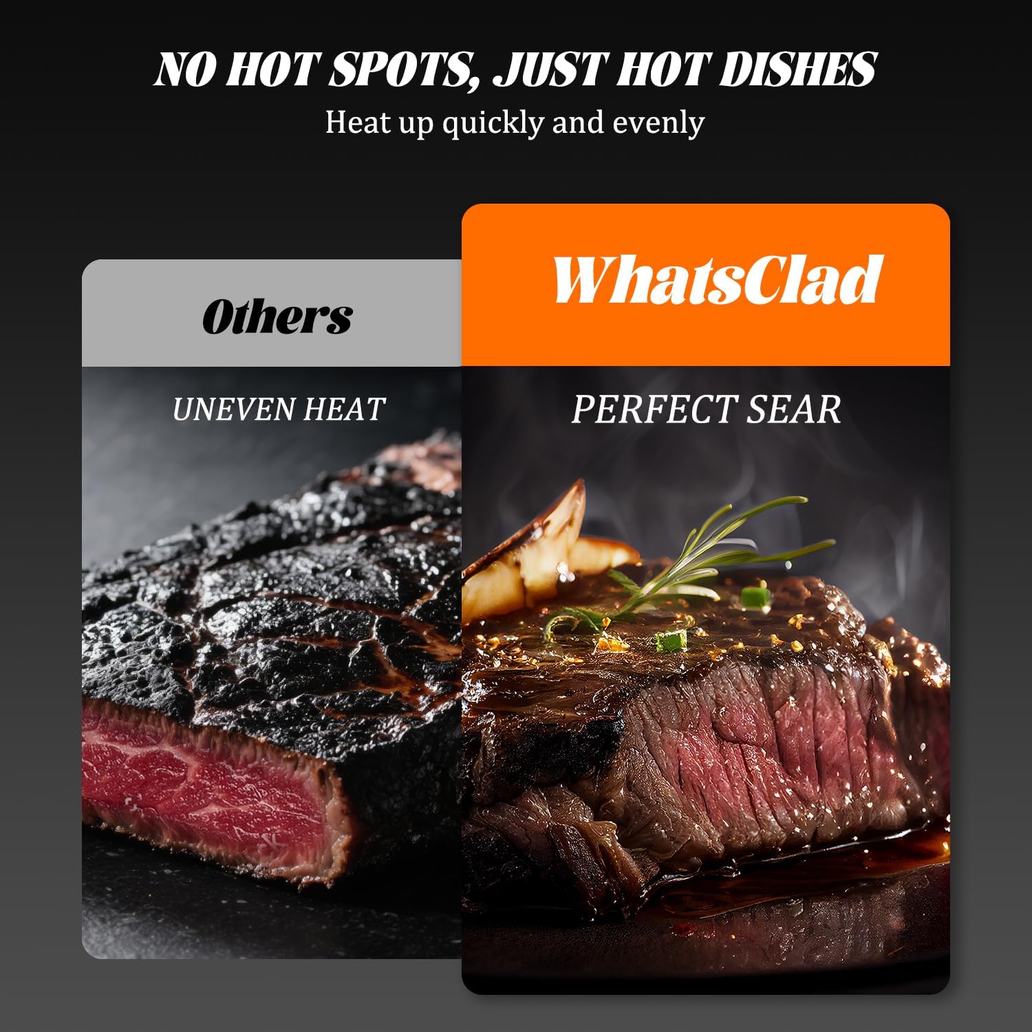 - Rapid & Even Heat Distribution: Built with a fully clad, hybrid 3-ply stainless steel core and 2-layer ceramic coatings, this frying pan heats up quickly and distributes heat evenly across the entire cooking surface. The inner aluminum core is sandwiched between two layers of stainless steel, eliminating hot spots. Perfect for searing a steak to a crust while locking juices inside or cooking an evenly-cooked, delicate omelet