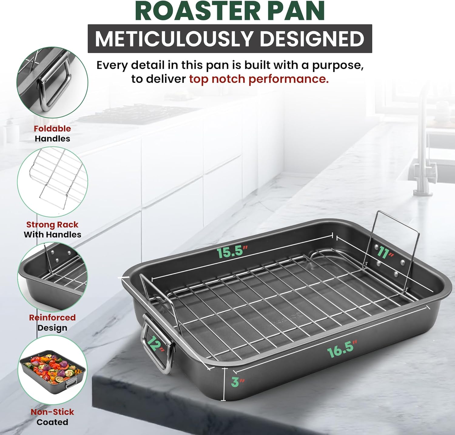 - DOUBLE LAYERED NONSTICK: Release your food easily with our turkey roasting pan with rack double-layered nonstick coating that will last and is oven-safe up to 450F