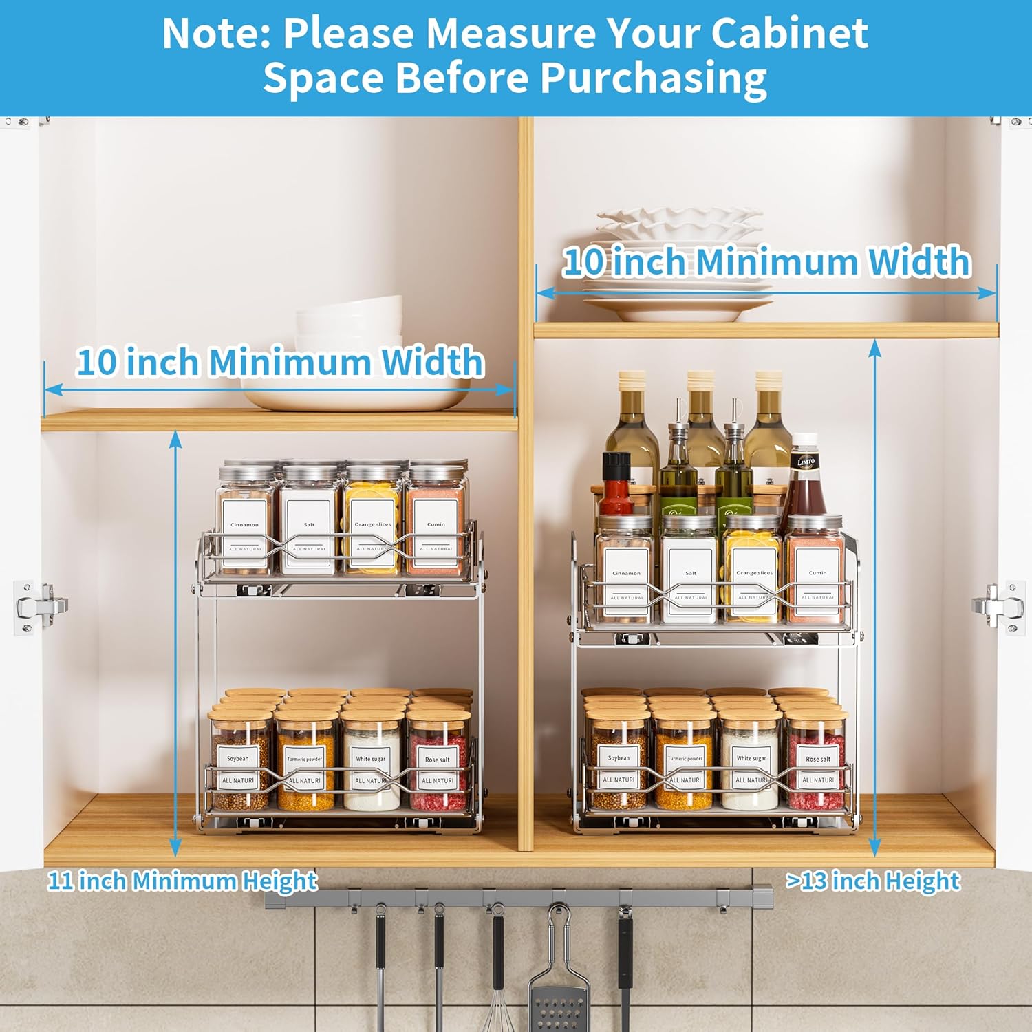 - PLEASE NOTE: Spice jars are not included! Product dimensions: 9.25”W x 10.5”D x 10“H. Cabinet must provide at least: 10”W x 11“D x 13”H space for installing and using the spice organizer. Please confirm your cabinet dimensions before ordering.