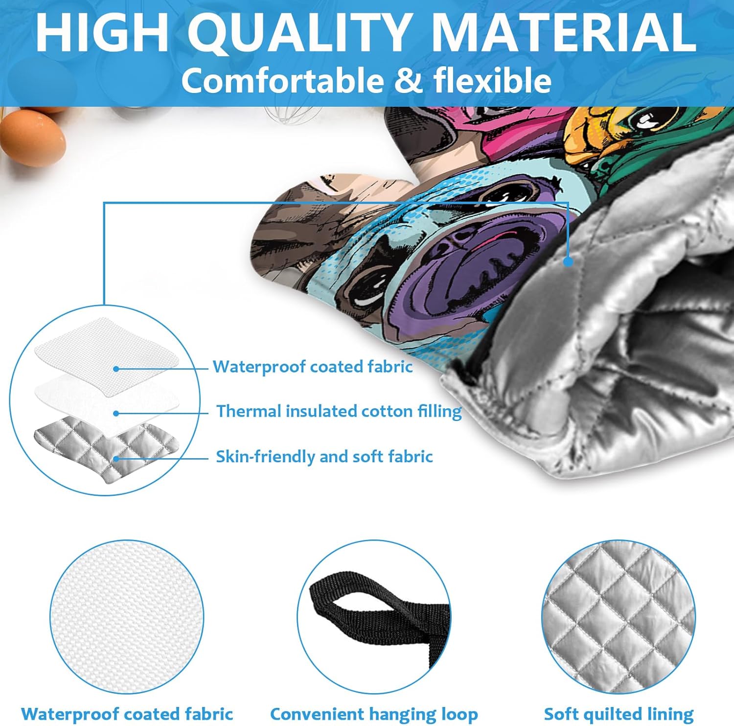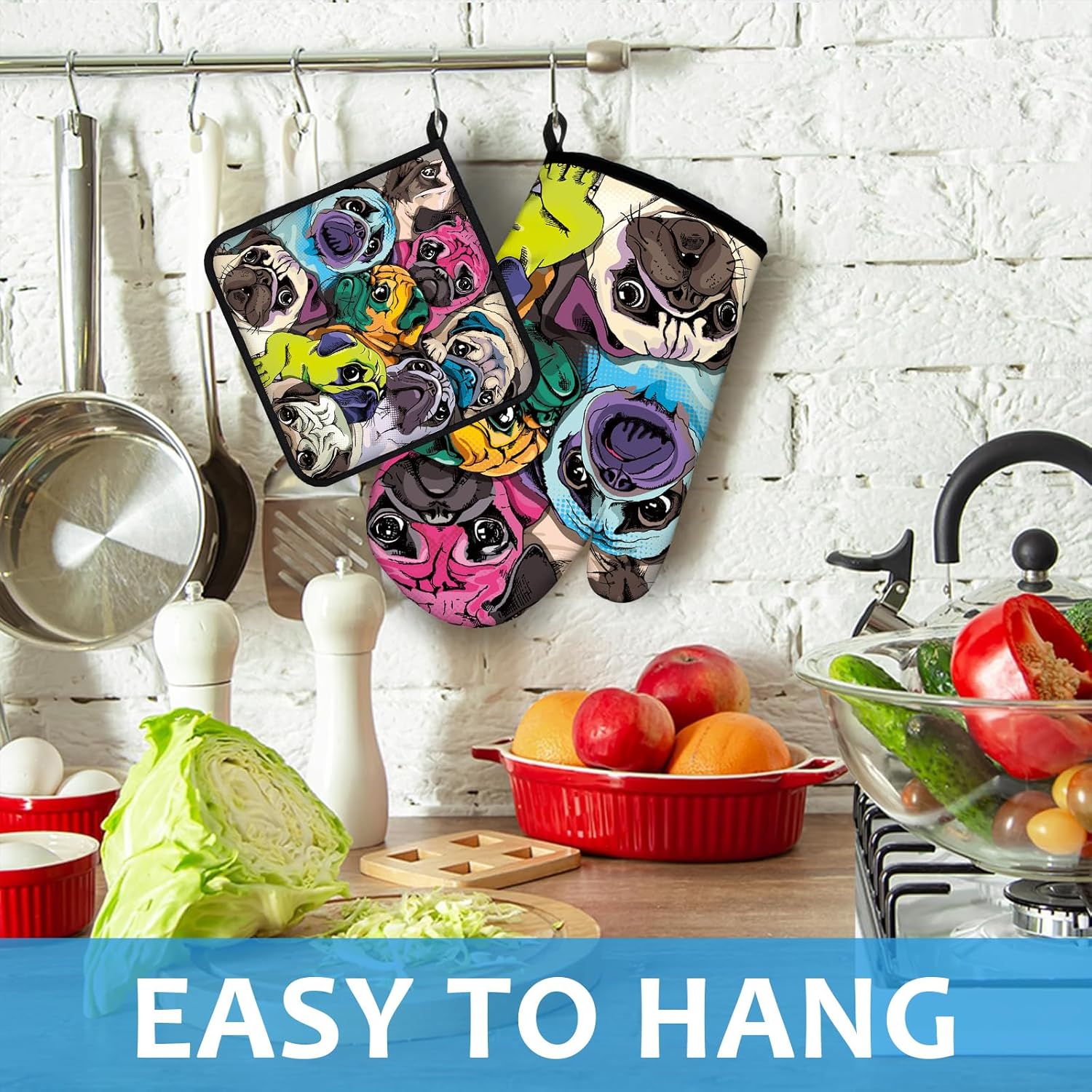 Colorful Pug Dog Face Oven Mitts and Pot Holders Sets Heat Resistant 4Pcs Potholders Oven Gloves Hot Pads for Kitchen Baking Cooking Grilling BBQ