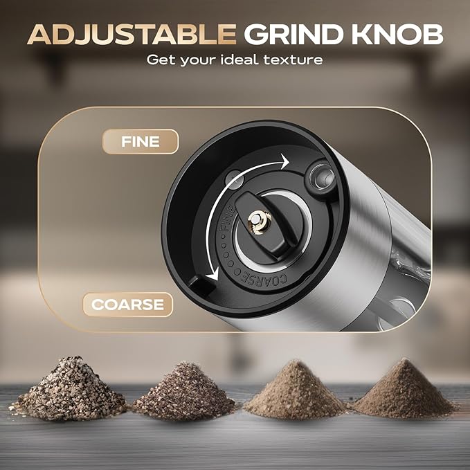 - 【One-Button Ease】Single-button control—no flipping required! At just 8 ounces, this electric pepper grinder feels light as a small water bottle in your hand—gentle on kids, seniors, and anyone with hand discomfort. Grab it and go, from kitchen to backyard BBQs