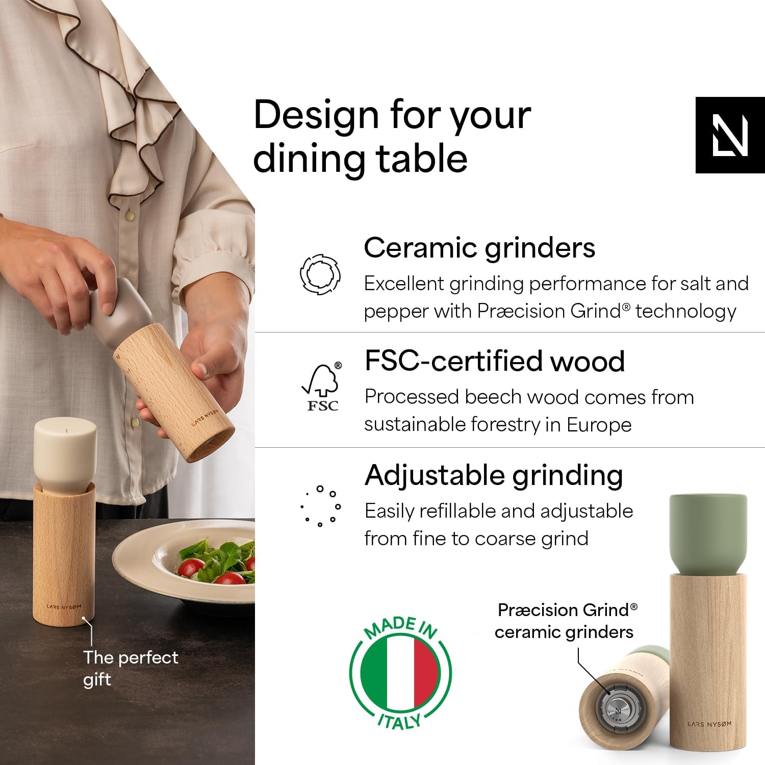 LARS NYSØM Wooden Salt and Pepper Grinder Set Manual with Tray - Salt and Pepper Mills with Adjustable Ceramic Grinder - Elegant Beechwood Pepper and Salt Mill Set for Dining Table (Sage Green)