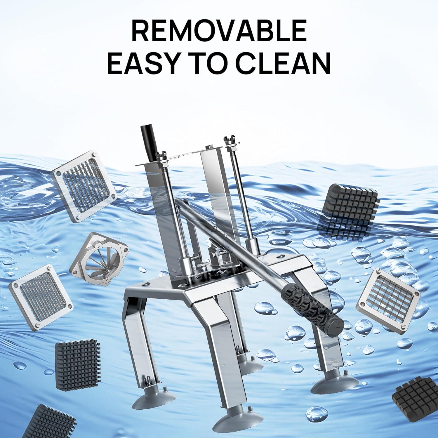 Commercial French Fry Cutter and Vegetable Fruit Dicer with 4 Stainless Steel Blades, Includes 3/8", 1/2", 1/4", and 8-Wedge Blades, Heavy Duty Potato Slicer for Home and Restaurant Use