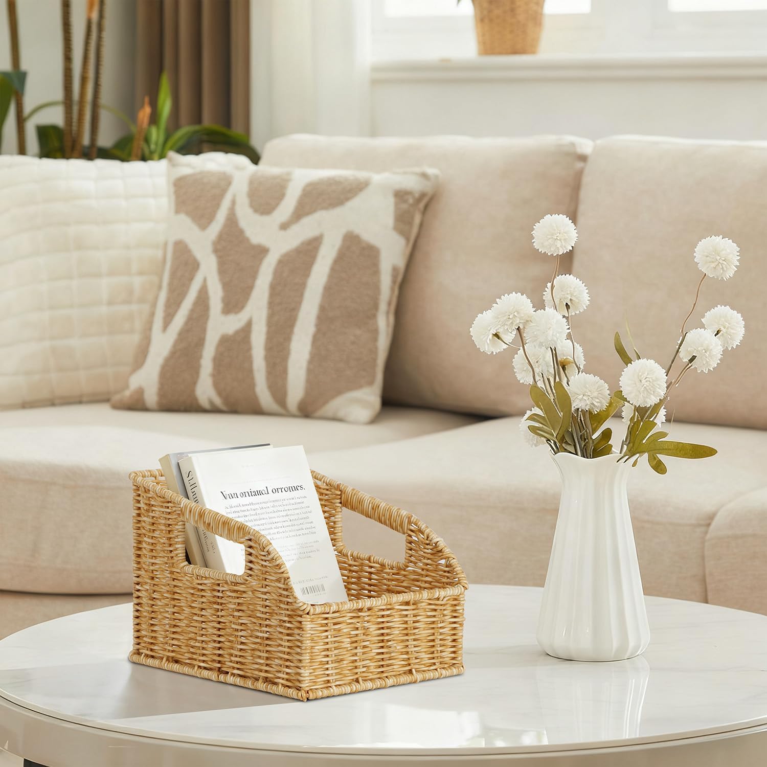 Wicker Baskets for Organizing,Pantry, Kitchen Counter with Handles, Handwoven Woven Storage Baskets for Fruit, Bread, Vegetable, Waterproof Plastic Storage Bins for Shelves, 3 Pack, Natural