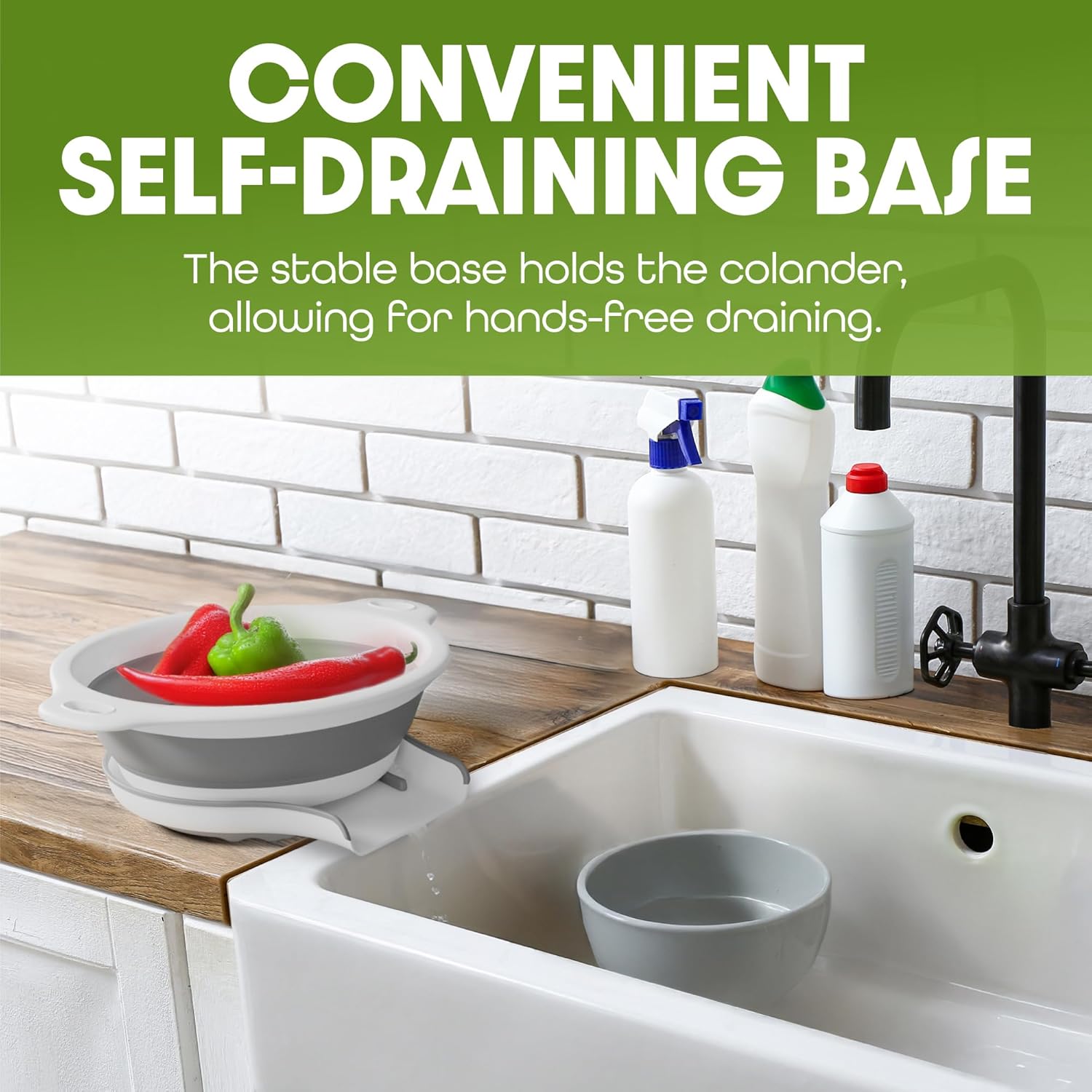 - This set of 2 collapsible colanders features an innovative self-draining base that allows water to drain directly into your sink, even when it's full.