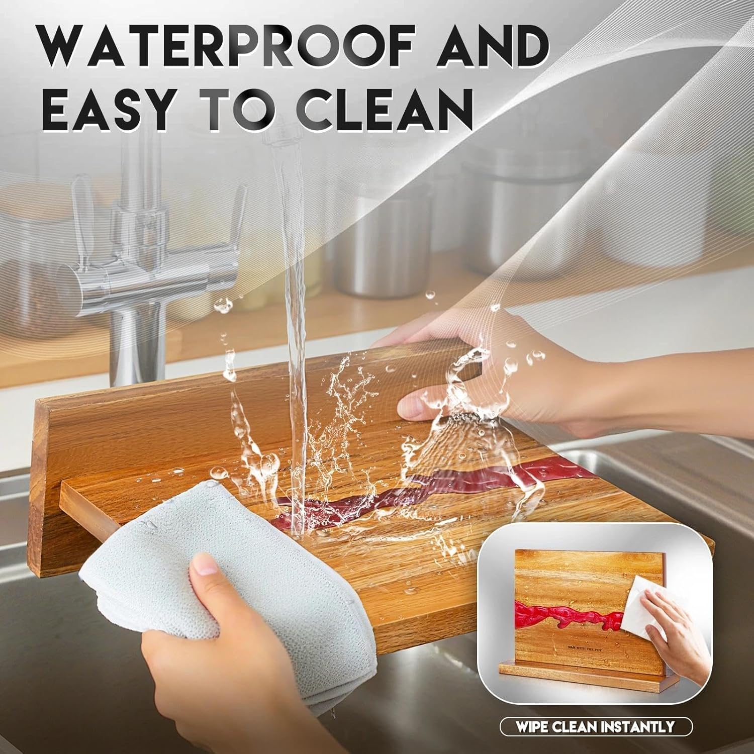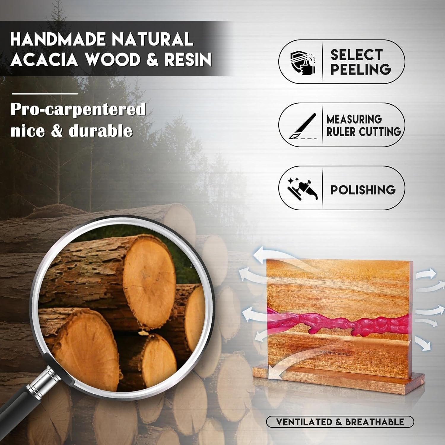 - [High-Quality Materials] Compact knife magnetic block: 14"L x 4.53"W x 10"H. Fits perfectly in any kitchen. Crafted by hand from carefully selected natural acacia wood and red resin. The acacia wood features a warm texture and excellent deformation resistance, scratch-resistant resin for a uniquely elegant look. The weighted thick base of knife holder ensures stability during use, preventing tipping. Wood magnetic knife holder offers both efficient knife storage and stylish countertop appeal