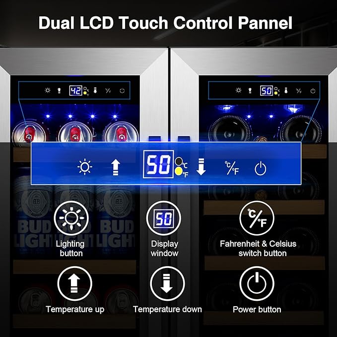 - Independent Dual Zone Cooling for Wine & Beverages:This 24 inch wine and beverage refrigerator offers two independently controlled zones. The left zone (35°F–50°F) chills beverages, while the right zone (41°F–64°F) preserves wine at ideal temperatures. Enjoy every drink at its best!