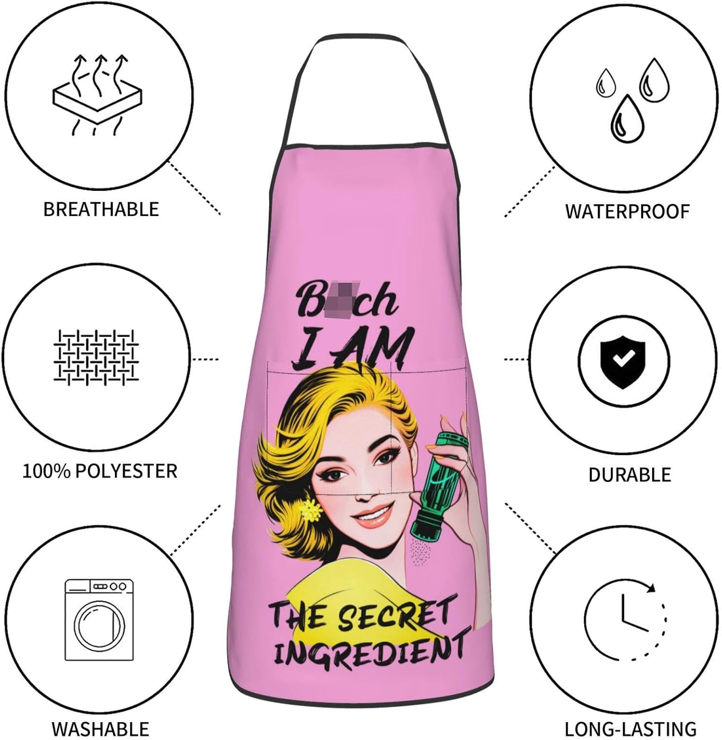 - Unique Design: Features a bold pink color with a retro pop - art style illustration of a woman and the sassy text “ I AM THE SECRET INGREDIENT”, adding a fun and personality - filled touch to your kitchen or outdoor cooking sessions. This design brings a dose of humor, confidence, and retro flair to your kitchen, making it not just a practical cooking tool but also a stylish piece of kitchen decor